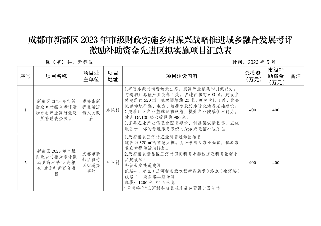 秉承公开、公平、公正的原则,区农业农村局会同区财政局、区住建局、区水务局、区交通运输局、区文体旅游局、区规划和自然资源局于4月19日对申报的项目进行了评审,确定拟实施项目公示如下:项目公示期为2023年5月11日-2023年5月17日(5个工作日)。反馈意见受理邮箱:xdxczxb@163.com 。